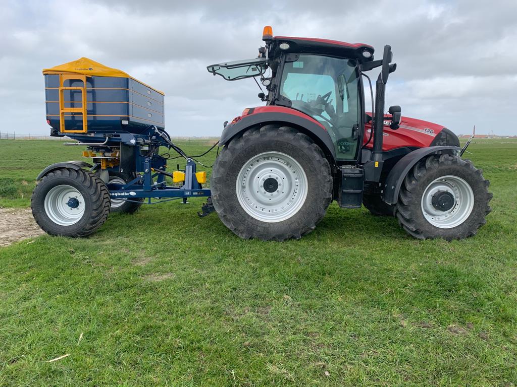 De ingebruikstelling van de Bogballe L20 bij een klant in Friesland is voor productspecialist Ron Smit van Homburg een mooi voorbeeld. “Omdat de teler greppels in het perceel heeft, wil hij niet te breed strooien. De werkbreedte is nu tot 24 meter. De maximale capaciteit is driehonderd liter per minuut, wat neer komt op duizend kilo per hectare. De strooier is op een trail onderstel gezet. Onder de bak zit een schijf en die bepaalt de doorlaat. Door die te verdraaien is de strooier ook geschikt voor het strooien van korrels tegen slakken en zaden.” Smit legt uit dat de M-line, de grotere serie strooiers, voorzien zijn van nog een extra grote opening voor bijvoorbeeld geperste korrels, die in Scandinavië veel in de bio worden gestrooid.