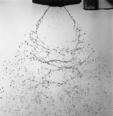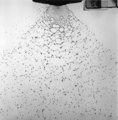 Codacide zorgt ervoor dat de druppels al ontstaan door perforatie van het spuitvlies en niet via slierten die uit elkaar breken. Links standaard spleetdop met één bar druk zonder Codacide, rechts met.