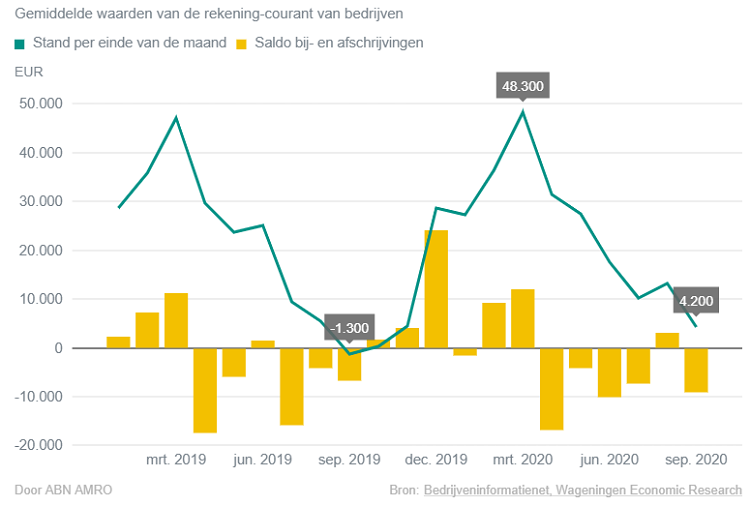 De gemiddelde stand op de lopende rekening van akkerbouwbedrijven was aan het eind van het derde kwartaal 2020 verder gedaald tot ruim 4.000 euro. Deze stand is hoger dan vorig jaar rond dezelfde tijd (- 1.300 euro). Deze verbetering is mede te danken aan de vervroegde uitbetaling van betalingsrechten door RVO. De akkerbouwbedrijven ontvingen in juli een voorschot van gemiddeld ruim 12.000 euro; normaal vindt deze betaling pas in december plaats. In augustus 2020 waren de bijschrijvingen hoger dan de afschrijvingen op de rekening-courant, in tegenstelling tot het jaar ervoor. Betalingen door aardappelverwerkers waren het derde kwartaal hoger dan het jaar ervoor, terwijl in mei en juni de betalingen nog sterk achterbleven bij 2019.