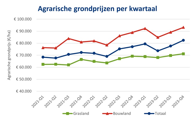 De gemiddelde agrarische grondprijs in Nederland is in het vierde kwartaal van 2023 met 6,2 procent gestegen ten opzichte van het derde kwartaal. Van 77.600 naar 82.400 euro per hectare. Over heel 2023 is de grondprijs uitgekomen op 78.800 euro per hectare, dit is 7,4 procent hoger dan in 2022 waar de grondprijs 73.400 euro per hectare was.