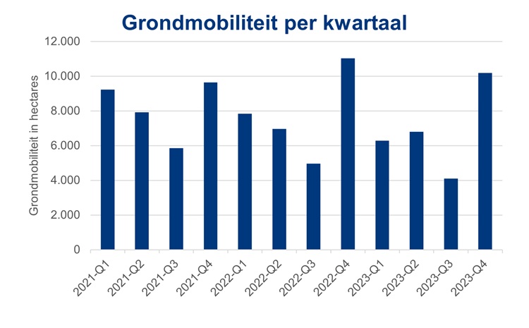 In het vierde kwartaal van 2023 is 10.200 hectare landbouwgrond verhandeld, ruim 800 hectare, zeven procent, minder dan in hetzelfde kwartaal van 2023. In heel 2023 is 27.400 hectare grond verhandeld. Dat is 11 procent minder dan in 2022, toen 30.800 hectare is overgedragen De relatieve grondmobiliteit – het verhandeld areaal afgezet tegen het totaal areaal landbouwgrond – kwam in 2023 uit op 1,53 procent, tegen 1,71 procent in dezelfde periode het jaar daarvoor.
