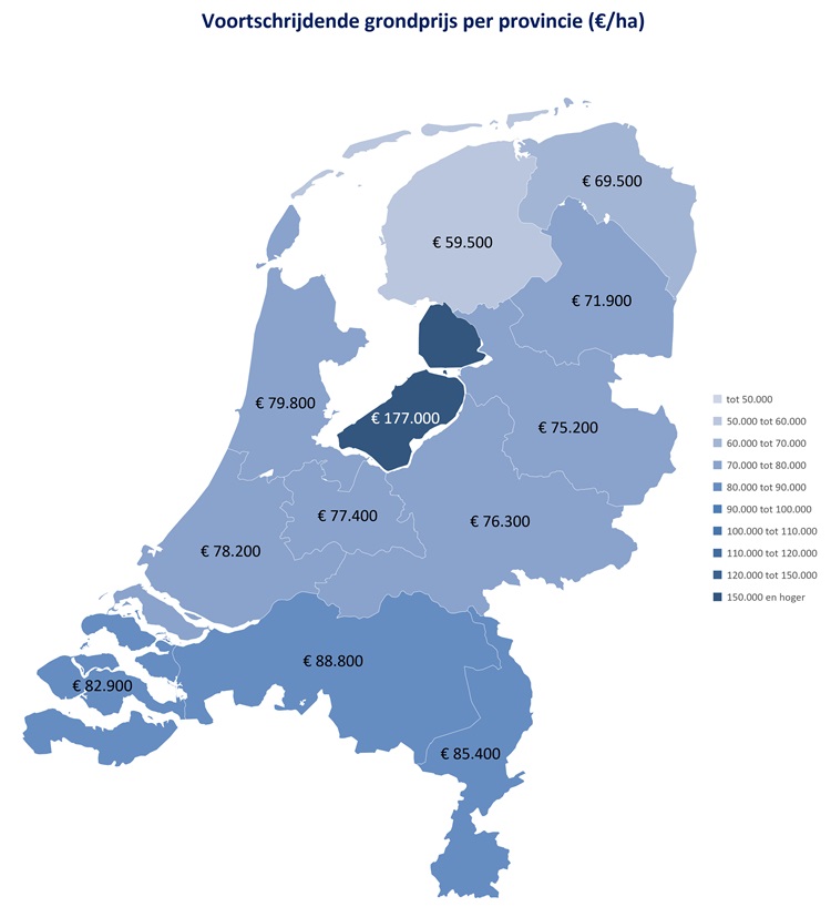 De gemiddelde agrarische grondprijs loopt in het vierde kwartaal van 2023 uiteen van 59.500 euro in Fryslân tot 177.000 euro per hectare in Flevoland. In de overige provincies ligt de grondprijs tussen de 69.500 euro in Groningen en 88.800 euro per hectare in Noord-Brabant.