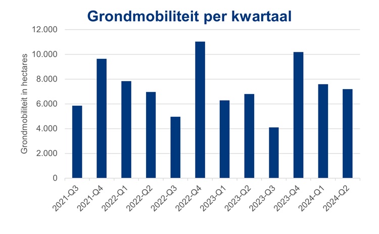 In het tweede kwartaal van 2024 is 7.200 hectare landbouwgrond verhandeld. Dit is 400 hectare (6%) meer dan in hetzelfde kwartaal van 2023. Gemeten over de laatste vier kwartalen is in totaal 29.100 hectare grond in andere handen overgegaan. Dat is evenveel als in dezelfde periode een jaar eerder. De relatieve grondmobiliteit – het verhandeld areaal afgezet tegen het totaal areaal landbouwgrond – over de vier laatste kwartalen bedroeg 1,62 procent. En is daarmee gelijk aan de mobiliteit in dezelfde periode het jaar daarvoor.