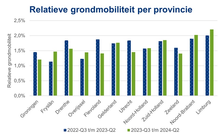 De relatieve grondmobiliteit – het verhandelde areaal afgezet tegen het totaal areaal landbouwgrond – varieert over de vier laatste kwartalen van 1,21 procent in Groningen tot 2,21 procent in Limburg. In vergelijking met een jaar eerder is de relatieve grondmobiliteit het sterkst gedaald in Flevoland en Utrecht met respectievelijk 0,5 en 0,4 procentpunt, en het sterkst gestegen in Friesland met 0,3 procentpunt.