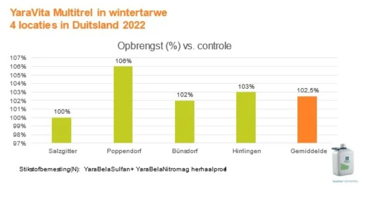 De proeven vonden afgelopen jaar plaats op vier locaties in Duitsland. Op alle locaties werd YaraVita Multitrel toegepast in wintertarwe. Op drie locaties werd een opbrengststijging waargenomen, op één locatie was dit jaar geen effect te zien. In de onderstaande grafiek zijn de resultaten van de proeven duidelijk te zien.