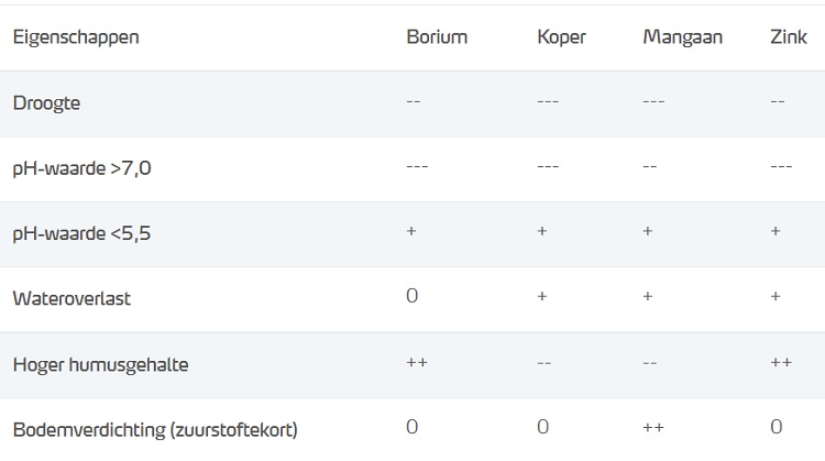 Over meerdere jaren heen gezien is het altijd waardevol om YaraVita Multitrel toe te passen als bladbemesting in wintertarwe. Ook al zijn er in sommige jaren op bepaalde locaties geen effecten waar te nemen. Dit is afhankelijk van de omstandigheden in het seizoen. De actuele omstandigheden beïnvloeden de beschikbaarheid van micronutriënten. Anders gezegd is de plantbehoefte in hoeveelheden altijd weer anders. Dit is duidelijk te zien in onderstaande tabel, die laat zien in hoeverre bepaalde nutriënten beschikbaar zijn voor de plant onder specifieke omstandigheden. Een ‘+’ betekent dat het element goed beschikbaar is, een ‘-‘ betekent dat het element niet goed beschikbaar is en/of een tekort optreedt.
