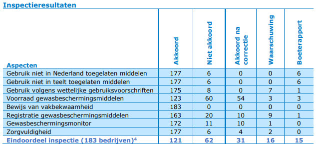 Bij 11% van de bedrijven is een boeterapport of schriftelijke waarschuwing met betrekking tot het gebruik van middelen aangezegd, waaronder voor het gebruik van imidacloprid (1x in suikerbiet) en thiametoxam (1x in aardappel). In 6 gevallen was er sprake van het gebruik van niet in de teelt toegelaten middelen. In 6 gevallen was er sprake van het gebruik van een niet (meer) in Nederland toegelaten middel. Bij 8 gevallen was er sprake van het overtreden van de wettelijke gebruiksvoorschriften van middelen waaronder overdosering, te vaak toepassen en het niet opvolgen van het minimale spuitinterval.