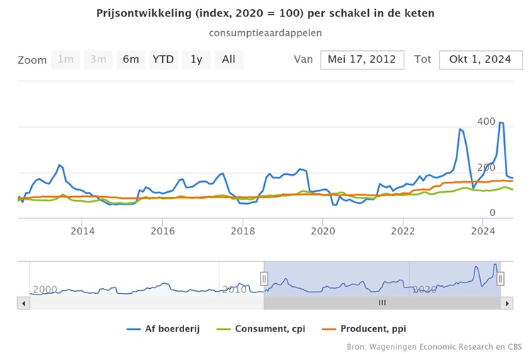 De consumentenprijsindex van aardappelen is in september 2024 uitgekomen op 128 punten. Dat is vier procent lager dan in juli 2024 en bijna één procent hoger dan in september 2023. De prijsindex af boerderij is weer gedaald, maar is met 371 punten nog steeds hoog. De index kwam in juli 2024 nog uit op 426 punten. Dat is een daling van 13 procent in de laatste twee maanden en een stijging van 74 procent ten opzichte van september vorig jaar.