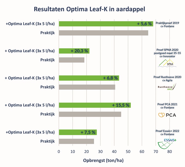 Tijdens de zomerperiode is de behoefte aan kalium (K) groot. Kalium is essentieel voor veel processen in het gewas, waaronder de uitgroei en vulling van de knol en de tolerantie voor droogte en hitte. Een drietal bladbespuitingen met Optima leaf-K vanaf het sluiten van de rijen voorziet in deze verhoogde kaliumbehoefte. In diverse trials hebben ze de afgelopen jaren al gezien dat die een significante opbrengstvermeerdering opleverden, van +5 tot +20 procent.