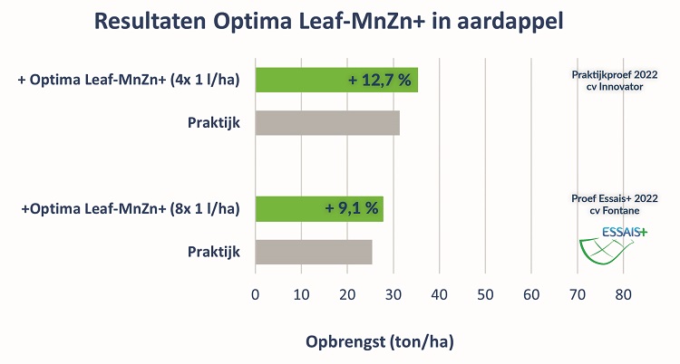Vanaf de start van de teelt is het essentieel om te zorgen voor een groen en daarmee productief blad. Hierbij spelen de elementen mangaan (Mn) en zink (Zn) een belangrijke rol. Vooral sinds het verdwijnen van mancozeb is het niet meer vanzelfsprekend dat het gewas over voldoende mangaan en zink kan beschikken. De inzet van een mangaan-zink bladvoedingsproduct zoals Optima Leaf-MnZn+ is daarmee onmisbaar geworden in de aardappelteelt, en brengt bewezen meeropbrengsten van rond +10 procent.