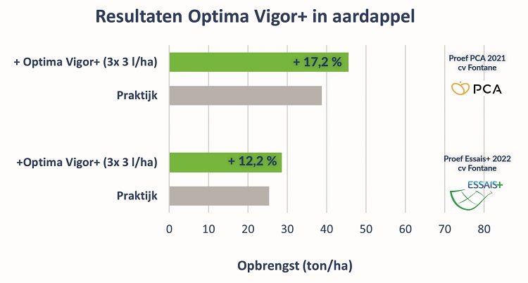 Optima Vigor+ is een bladvoedingsproduct op basis van calcium en mangaan, waarmee de vitaliteit van het blad geoptimaliseerd kan worden en het gewas minder gevoelig wordt voor stressomstandigheden. Al meerdere opeenvolgende jaren bewijst Optima Vigor+ zich in proeven door meer knollen, van een hogere kwaliteit én door meer opbrengst, van +10 tot +17 procent.