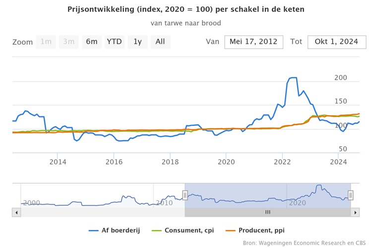 De consumentenprijsindex van brood is in juli uitgekomen op 125 punten. Dit is een lichte daling ten opzichte van de maanden ervoor toen dit prijsniveau rond de 126 punten lag. Maar nog wel in lijn met het hogere prijsniveau dat sinds het begin van 2023 rond de 125-127 punten ligt. Dat is ruim boven het prijsniveau van de jaren daarvoor toen het rond de 100-110 punten lag. De producentenprijsindex is uitgekomen op 130 punten in september 2024 en daarmee nagenoeg onveranderd ten opzichte van twee maanden daarvoor. Het is wel ruim twee procent hoger dan het prijsniveau van september 2023.