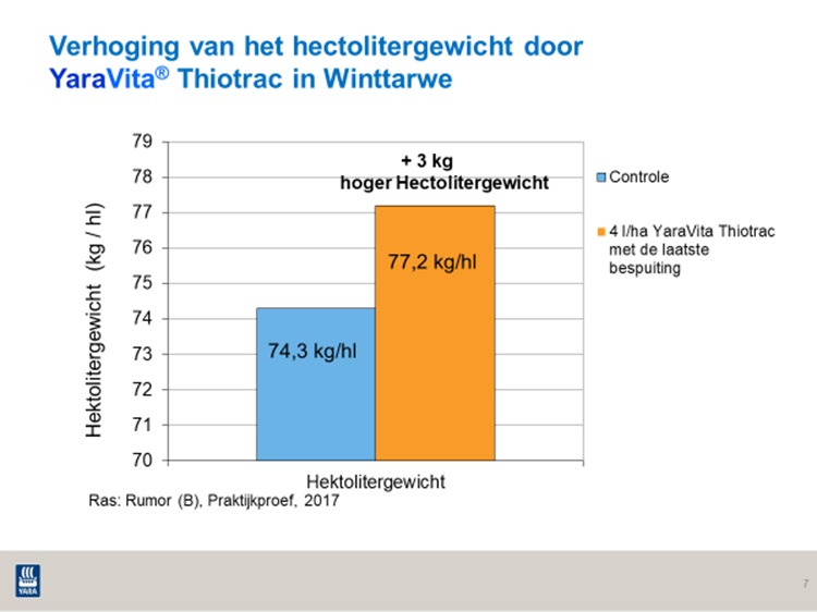 Naast de basisbemesting met Sulfan, is de toepassing van YaraVita Thiotrac aanbevolen. Deze bladmeststof bevat 200 g/l stikstof en 300 g/l zwavel (S). Thiotrac kan zijn toegepast tot het BBCH-stadium 79. We raden een toepassing aan van 2x 3l/ha (BBCH 39-79) of een eenmalige toepassing van 5 l/ha (BBCH 59-79). Onderstaande proefresultaten laten goed de meerwaarde van YaraVita Thiotrac zien.