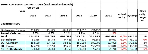 In alle landen is er een daling van het aardappelareaal. Nederland en België, die de afgelopen jaren de hoogste stijgingen in oppervlakte hadden, zijn de enige met een lager aantal hectares dan het vijf-jaargemiddelde. Dit is een historische gebeurtenis, omdat voor deze twee landen het areaal jaar na jaar is gestegen voor de laatste twee decennia. Daarentegen zal de opbrengst van de oogst 2021 meer van de productie per hectare afhangen dan van het totale areaal. Zie ook de tabel hieronder.
