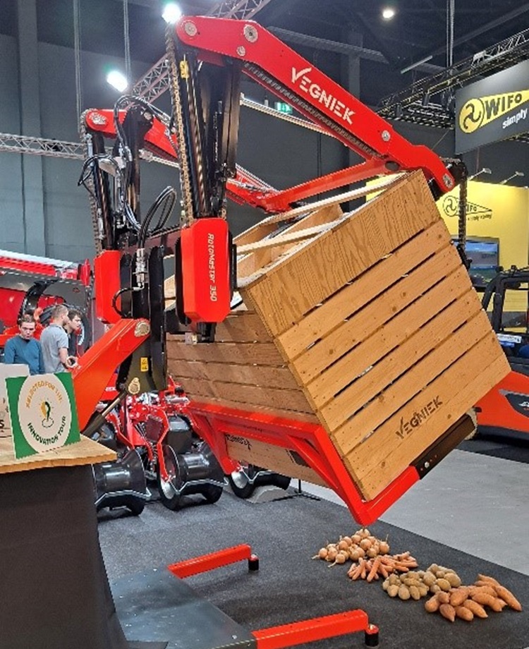 De RM350 van Vegniek is een compacte en robuuste vooroverkantelaar met dertig procent meer capaciteit dankzij de korte voorbouwmaat. Hij heeft geen draaipunten aan de zijkant van de kist, waardoor hij kisten kan oppakken die in een rij staan. De bovenklem kan daarnaast ook volledig achterover, waardoor ook meerdere kisten gelijktijdig getransporteerd kunnen zijn.
