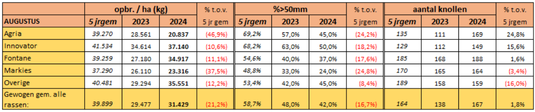 De gemiddelde opbrengst van de monsters is vastgesteld op 31.4 ton per hectare. In vergelijking met vorig jaar is de opbrengst per hectare 6,6 procent hoger, maar komt daarmee wel 21,2 procent onder het niveau van het gemiddelde van de afgelopen 5 jaar.