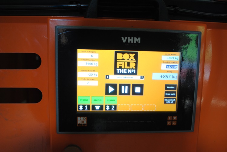 Door middel van een eenvoudig multifunctioneel display wordt alles ingesteld. “Die stuurt de klep onderin de trechter aan. Ik stel het juiste gewicht in. Nu heb ik die op negenhonderd kilo ingesteld. Zit er veel grond in, dan kies ik voor iets meer kilo’s. Dat is als de lading binnenkomt even af tasten. De kistenvuller beschikt over een weeg- en registratiesysteem, waardoor ik verder niet meer naar hoef te kijken. In het begin misschien om te kijken of mijn ingestelde kilo’s overeenkomen. Uiteindelijk moet de kist goed gevuld zijn.”