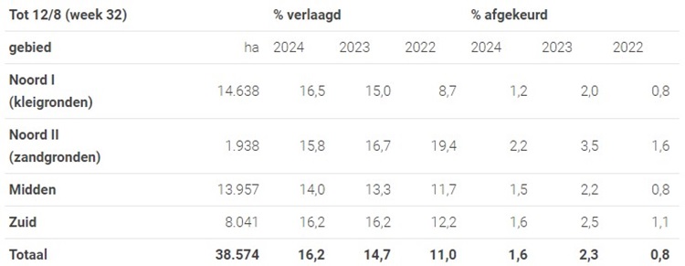 Onderstaande tabel geeft het afkeurings- en verlagingspercentage van de afgelopen drie jaar weer per gebied. Het verlagingspercentage ligt op 16,2 procent. Dit is hoger dan vorig jaar. De NAK keurde in 2024 een percentage van 1,6 procent af.