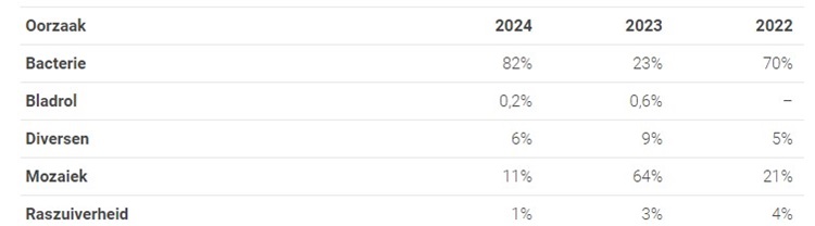 In 2024 waren bacteriën in de meeste gevallen verantwoordelijk voor een verlaging. 82 procent van de verlagingen werd veroorzaakt door deze ziekteverwekkers. In elf procent van de gevallen was mozaïek de verantwoordelijke ziekteverwekker. De percentages voor bladrol en overig liggen een stuk lager, met respectievelijk 0,2 en zes procent. Tenslotte zorgt raszuiverheid voor één procent van de verlagingen.