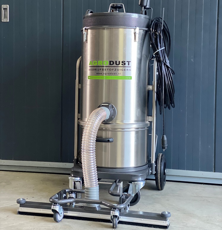 Het belang van een stofvrije werkomgeving is dus erg belangrijk. Daar biedt Agrodust een oplossing voor. “Een bedrijfsstofzuiger heeft een ander filtermechanisme dan huis-tuin-en-keuken stofzuigers”, vertelt Schuringa. “Ook zijn de motoren krachtiger. Dit maakt het geschikt om grote hoeveelheden stof en vuil te verwijderen in bijvoorbeeld schuren en werkplaatsen.” De stofzuiger zuigt het vuil op met een vast vloermondstuk. Deze zuigmond is hefbaar, zodat grover vuil ook kan worden verwijderd. Via drie krachtige zuigmotoren gaat het stof naar een filter, dat 99,99 procent gecoat is. Deze gladde laag in combinatie met een mechanische filterklopper zorgt ervoor dat vrijwel al het stof naar beneden valt in een uitneembare vuilcontainer.