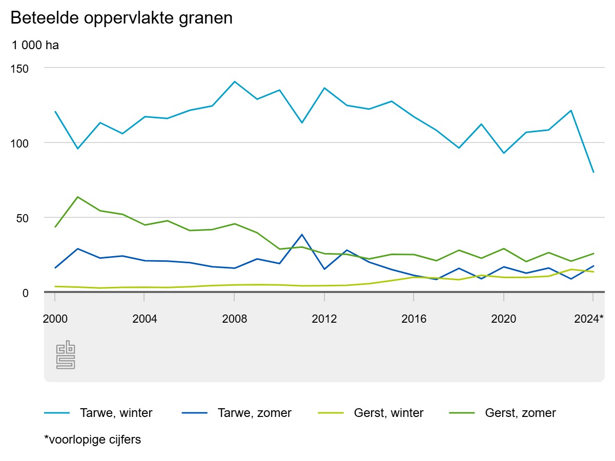 De bruto-opbrengst van de tarweoogst is sinds 2000 niet zo laag geweest. Dit komt vooral door tegenvallende oogstcijfers van wintertarwe als gevolg van een nat najaar in 2023. Wintertarwe wordt in het najaar ingezaaid. Er werd in 2024 slechts 574 duizend ton wintertarwe van het land gehaald, 45,9 procent minder dan een jaar eerder. Zowel het areaal (de oppervlakte) als de opbrengst per hectare zijn het laatste jaar afgenomen.