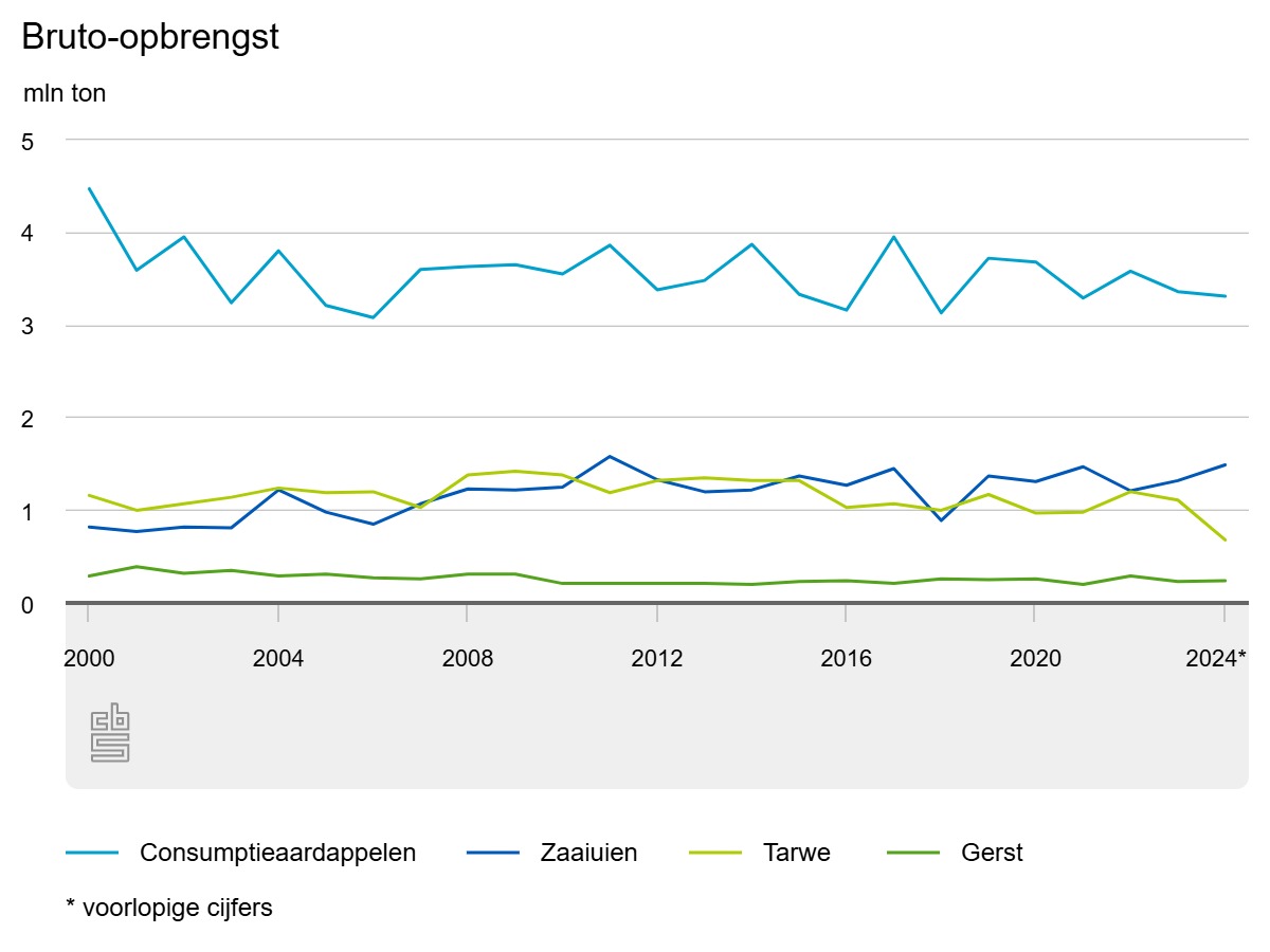 De bruto-opbrengst van de tarweoogst was in 2024 met 682 duizend ton 38,6 procent lager dan een jaar eerder. Dat is de laagste bruto-opbrengst in 25 jaar. De bruto-opbrengst van consumptieaardappelen nam het laatste jaar ook af, met 1,5 procent. Van zaaiuien (+13,2 procent) en gerst (+3,8 procent) vielen de bruto-opbrengsten hoger uit. Dat blijkt uit de definitieve oogstraming akkerbouw van het CBS.