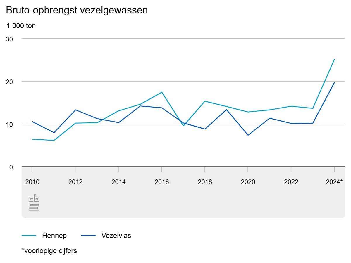 Net als een jaar eerder is de opbrengst van vezelgewassen in 2024 weer toegenomen. Vlas en hennep hebben maar een klein aandeel in de totale bruto-opbrengst van akkerbouwgewassen. Toch hebben zij afgelopen jaar van alle akkerbouwgewassen de meeste productiegroei (+88,2 procent) doorgemaakt.