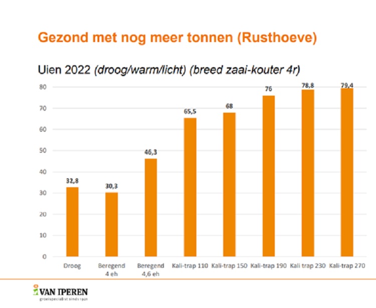 Teeltjaar 2022 kenmerkte zich weer door droogte, hoge temperaturen en veel zonuren. Alle proeven zijn op anderhalve meter bedden met vier breed gezaaide rijen gelegd. In de fertigatieproeven is gewerkt met verschillende kali-giften. Het opbrengstverschil bij de hoogste kaligift ten opzichte van regulier kunstmest strooien en beregenen, bedroeg 33 ton bij het zaaien van 4,5 eenheden én 49 ton ten opzichte van het zaaien van vier eenheden. Het ‘dikker zaaien’ bij het gebruik van een breed-zaai kouter heeft zich in deze proef ‘extra’ uitbetaald met een meeropbrengst van zestien ton. Deze meeropbrengst is dus ook bij regulier beregenen te behalen. Uit de praktijk blijkt dat het optimum van zaaien tussen de 4 en de 4,2 eenheden ligt, in gele uien met fertigatie.