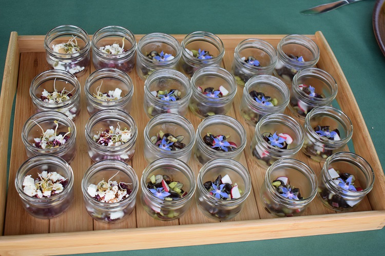 Voorafgaand aan de rondleiding zijn we uitgenodigd om mee aan te schuiven voor een maaltijd waarin deze producten maximaal verwerkt waren. Bovendien waren heel wat van de telers ook zelf aanwezig om een toelichting te geven bij hun product en de teelt ervan. Rode bietensalade met schapenkaas, gele mosterd, dederzaad en dederolie; salade met tomaatjes, olijven, pompoenpitten, munt en quinoa; brood met goudsbloemconfituur. Het is maar een greep uit het menu. Het was ronduit lekker, dus extra interessant om meer te weten te komen over de verschillende teelten.