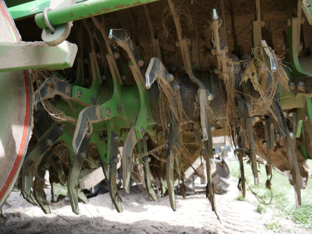 De AVR-ruggenfrees na testvergelijk aangeschaft. De Regt: “Doordat bij deze frees de freeshaken loodrecht op de rotoras staan gemonteerd is er plaats voor meer freestanden. Hierdoor is de freeswerking intensiever, maar loopt de machine lichter. Dit werkt brandstof besparend. De haken staan zo gemonteerd dat op ieder moment altijd evenveel haken de grond bewerken”.
