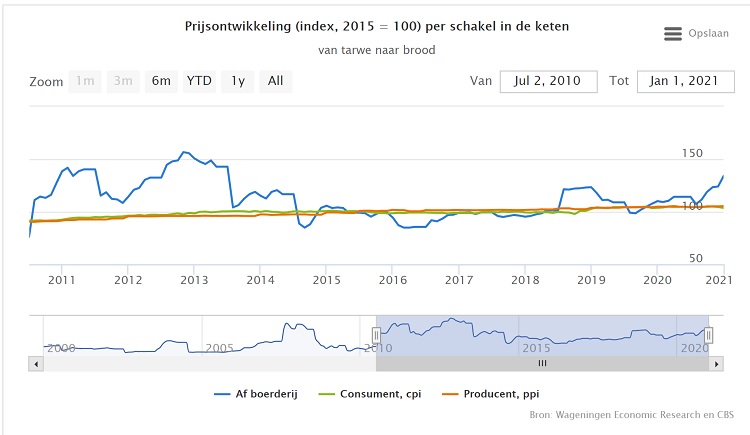 In januari 2021 is de consumentenprijs van brood uitgekomen op 104 punten, iets lager dan twee maanden daarvoor en nagenoeg even hoog als in januari vorig jaar. In januari 2021 lag de producentenindex op 105 punten. De vrijwel stabiele prijs van brood houdt verband met het via contracten afdekken van de grondstofvoorziening en de bijbehorende prijsrisico’s door de industrie. De consumentenprijzen en producentenprijzen zijn op korte termijn weinig gevoelig voor veranderende telersprijzen. Wereldwijd werd seizoen 2020 gekenmerkt door goede graanopbrengsten.