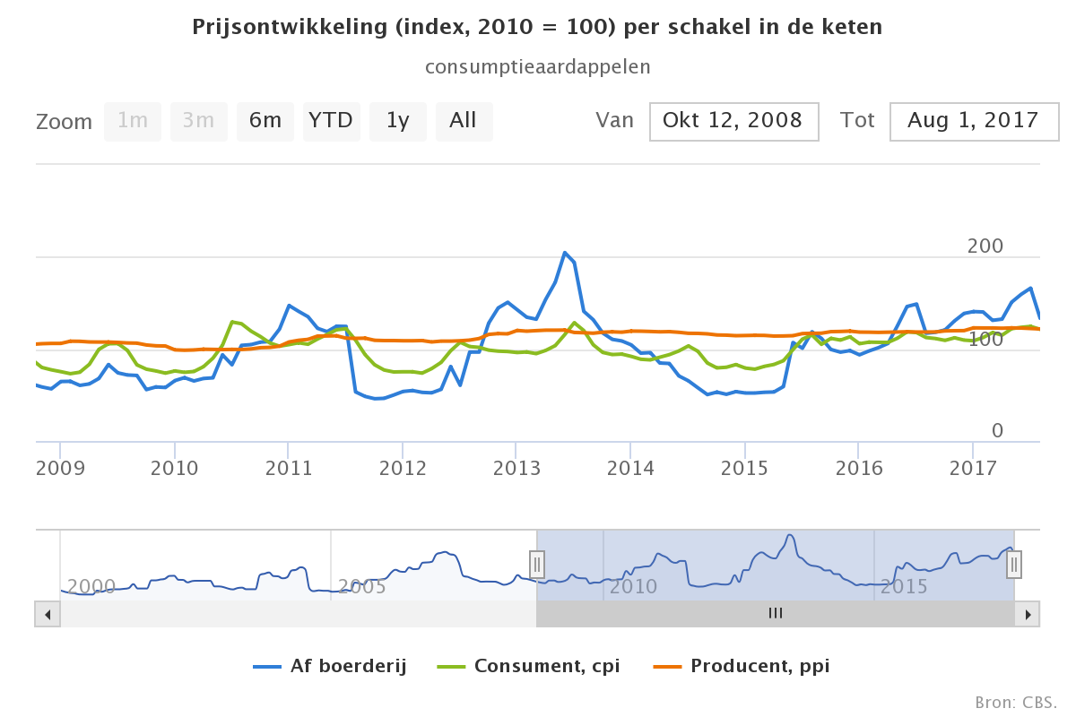 De consumentenprijs van aardappelen is in de periode januari-juli gestegen en in juli uitgekomen op 125 punten (2010=100). De producentenprijs is vanaf begin 2017 stabiel en ligt iets onder 123 punten. De aardappelprijs af boerderij is vanaf de oogst in 2016 met bijna 35% opgelopen tot 159 punten in juni, maar in juli gedaald. Verwacht wordt dat die prijs door de gunstige oogstvooruitzichten en areaaluitbreiding in het nieuwe seizoen onder druk zal staan.