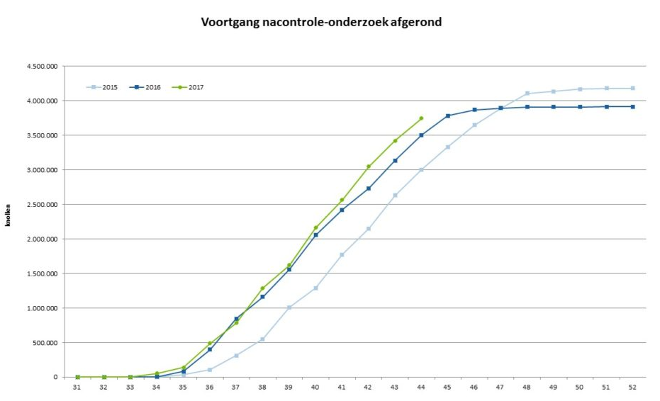 De grafiek ‘voortgang nacontrole-onderzoek afgerond’ geeft een indruk van de voortgang van het aantal afgeronde nacontrole onderzoeken in vergelijking met voorgaande jaren.