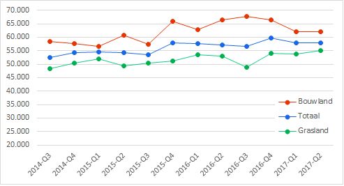 De prijs van grasland is in het tweede kwartaal van 2017 met 2,6% gestegen (ten opzichte van het eerste kwartaal) van 53.700 euro tot 55.100 euro per ha (figuur 1).