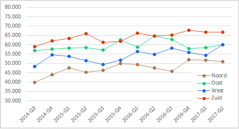 In landsdeel Zuid is de gemiddelde agrarische grondprijs in het tweede kwartaal van dit jaar niet veranderd. De prijs is met 66.700 euro per ha (kaart 1 en figuur 3) ook vrijwel gelijk aan die over heel 2016 (66.400 euro per ha). De grondprijs in Zuid ligt in het tweede kwartaal van dit jaar ruim boven die in andere landsdelen: het verschil met Oost en West is 11% en met Noord 31%.