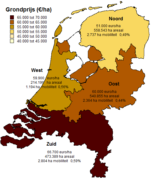 Aan de hand van vier landsdelen wordt een indruk gegeven van de regionale verscheidenheid in de agrarische grondmarkt. Deze landsdelen zijn opgebouwd uit de 14 groepen van landbouwgebieden (zie verantwoording). Landsdeel Zuid kent de hoogste grondprijzen (zie kaart 1 en figuur 3), vanaf 2012 gemiddeld 17% boven het Nederlandse gemiddelde. Landbouwgrond in landsdeel Noord is het laagst geprijsd, gemiddeld 17% onder het landelijk niveau (van 2012 tot nu).