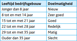 Voor de bepaling van de doelmatigheidscategorie is de leeftijd dikwijls een goede indicatie. Een bedrijfsgebouw wordt in het algemeen minder doelmatig naarmate het ouder wordt: