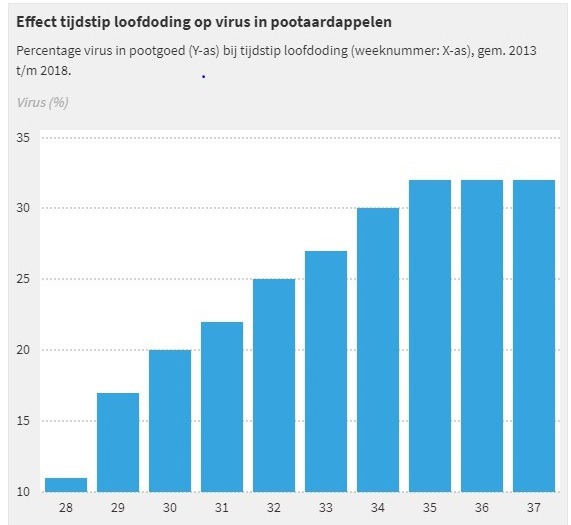 Closer en Sequoia zijn toegelaten na de bloei van de aardappelen. Volgens de BBCH schaal betekent dit stadium 69 (= einde bloei). Dat moment varieert uiteraard per ras en per jaar. Uit onderzoek van de NAK (gedurende 2013 tot 2018) weten we dat een groot deel van de virusaantasting ook na de bloei ontstaat. Gemiddeld was het % virus aantasting op moment van loofdoding rond ½ juli iets meer dan 10%. Bij loofdoding eind augustus was dit % virus aantasting al opgelopen naar ruim 30%.