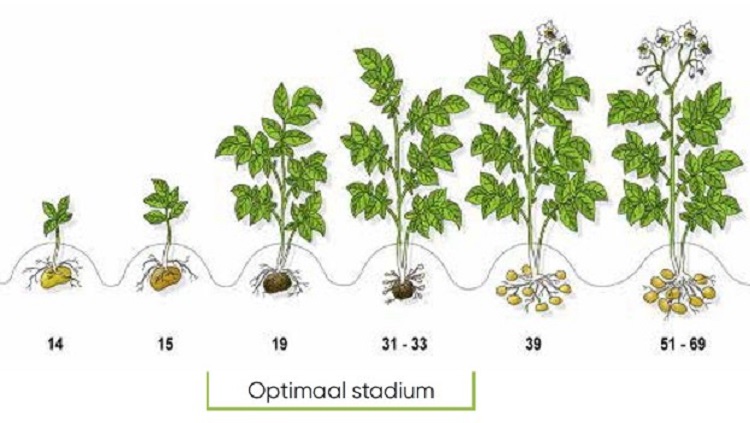 De meeste aardappelen staan intussen boven de grond en bereiken binnenkort het ideale stadium om het nieuwe middel BlueN toe te passen. Met BlueN kunnen gewassen stikstof binden uit de lucht. Zo wordt de stikstofvoorziening van het gewas bevorderd op een milieuvriendelijke manier en ook de fotosynthese wordt gestimuleerd.