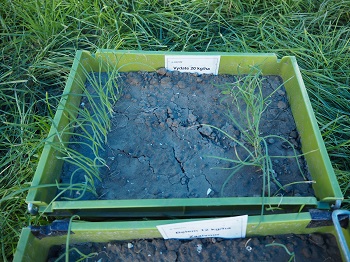Links bij toepassing Vydate vollevelds is zijn uien afgestorven door de uienvlieg. Rechts bij de toepassing van Vydate in de zaaivoor zijn de uien nog wel gezond.