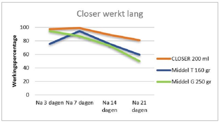Onderstaande grafiek toont de lange werking van Closer in een demoproef op aardappeltopluis in 2019. Ook in proeven tegen andere luizensoorten (zoals de perzikbladluis) zien we deze lange duurwerking.