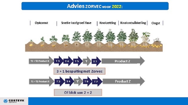 De eerste percelen beginnen nu aan de snelle loofgroeifase. Dat is het moment dat alle eigenschappen van Zorvec het beste benut worden. “Ons advies is niet veranderd: Een blok van drie bespuitingen vanaf de snelle loofgroeifase, daarna afwisselen met een ander product om vervolgens nog een vierde toepassing uit te kunnen voeren. Of twee blokken van twee toepassingen en tussendoor afgewisseld door een ander product.”