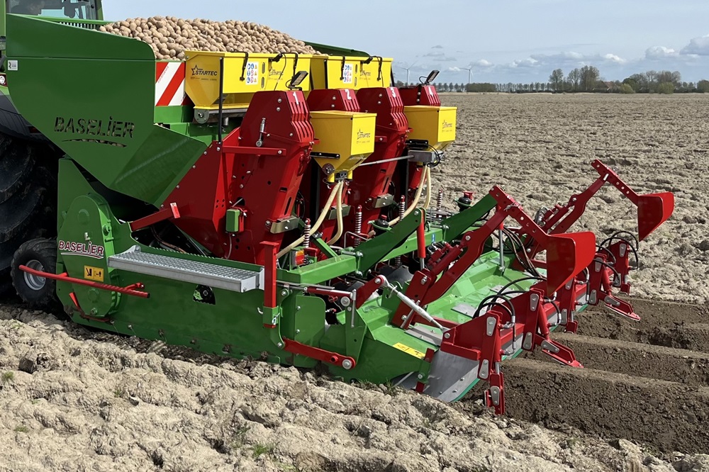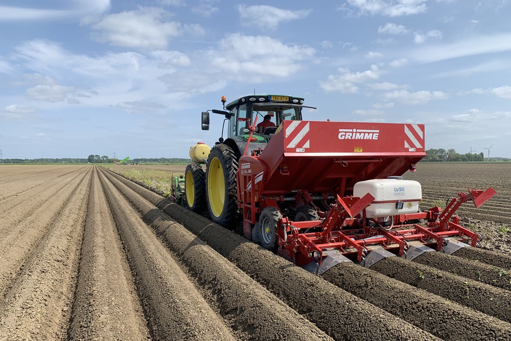 Van Tiggelen poot de aardappelen dit jaar voor het derde seizoen met de combinatie waar de LVS-set op is gebouwd. Jan Geluk, die het akkerbouwbedrijf ondersteunt tijdens de pieken in het seizoen, werkt voornamelijk met de allin-one pootgoedtrein. In de front hangt een omgebouwde Baselier beddenfrees, die extra diep de grond in gaat. Achter de trekker brengt de Grimme GL420 de poters in de grond. Woeltanden en een aanaardkap zorgen ervoor dat er een mooie aardappelrug ontstaat. De grondbehandeling maakt deel uit van werkgang. “In principe hoeven we er dan maar één keer overheen”, verklaart Jan Geluk.