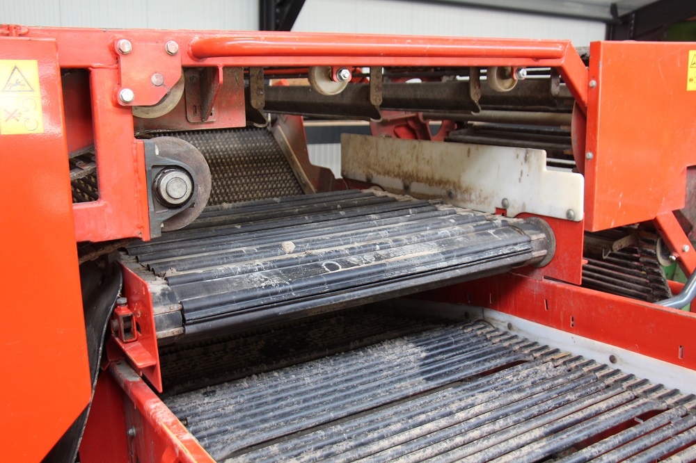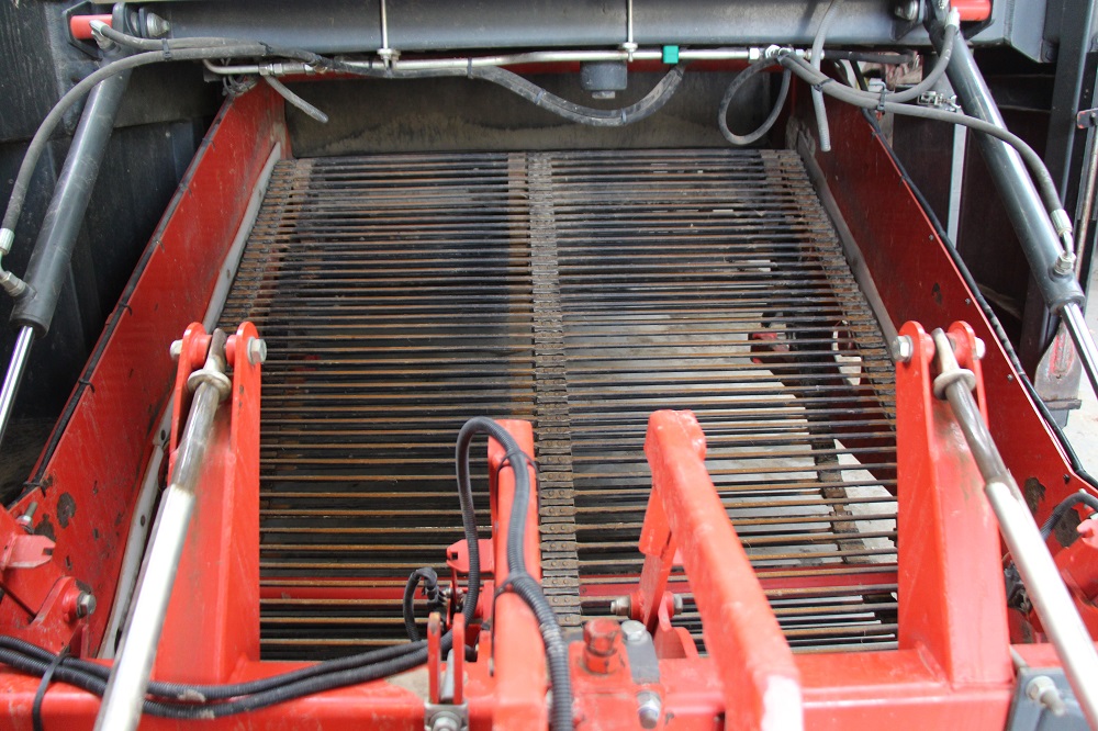 De ringelevator brengt de aardappelen (in dit geval) op het korte terugvoerbandje waarna de tweede egelband het product overneemt. Daarna gaan ze via de leesband naar de 11 m3 grote bunker. Dewulf adviseert Belgische en Nederlandse klanten steevast een 1,5 m brede rooiunit en graafmat omdat je daarmee minder last hebt van het loof van de naastliggende rug.