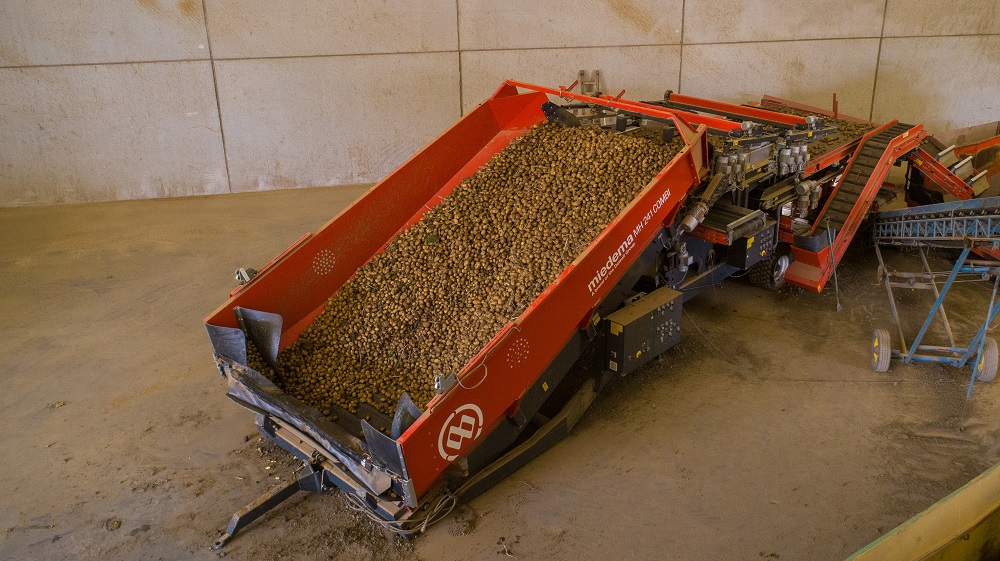 Op de Interpom-beurs zal de MHC 241 stortbunker, met een praktisch volume tot 20 m³, uitgerust zijn met 2 reinigingsunits van elk 8 spiraalrollen. De reiniging gebeurt met behulp van de Clean-Boost-unit. Met deze optie kan de snelheid van de elektrisch aangedreven PU-rollen kortstondig worden verhoogd. Op die manier worden ze ontdaan van aanklevende grond om zo de reinigingscapaciteit optimaal te benutten. De combinatie met een dubbele steen-en kluitenscheider zorgt zo voor een excellente verwerking met respect voor het product.