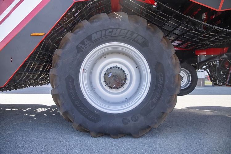 De VENTOR 4150 kan optioneel met de grote MICHELIN CEREXBIB 2 banden in de maat VF 900/60 R38 uitgevoerd zijn. Dankzij de MICHELIN Ultraflex technologie kunnen deze banden met een geringe bandenspanning rijden, waardoor een goede bodembescherming en bedrijfszekerheid gerealiseerd is.