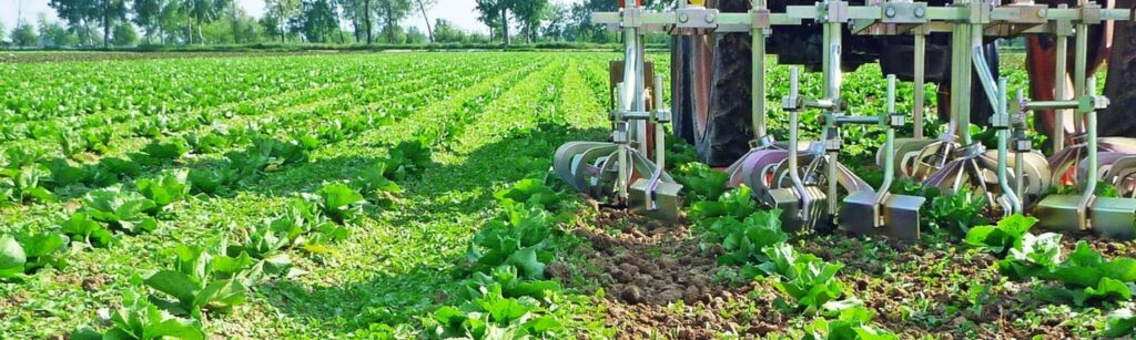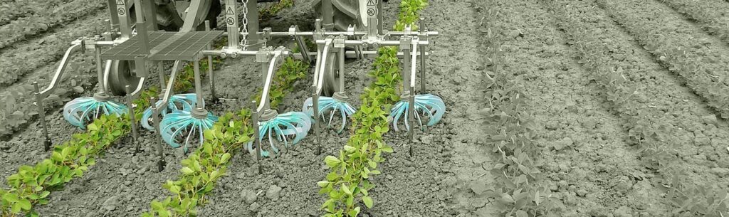 De Optyma interrow is een schoffeltechniek speciaal ontwikkeld voor groenten. Hiermee wordt in de grond gewied met twee kleine messen, die in de plantenrij de onkruiden automatisch weg schoffelt zonder grond op de plant te gooien. “Uniek is dat de machine bodemvolgend is. De techniek is hydraulisch, waardoor je kracht en snelheid altijd kunt regelen.”