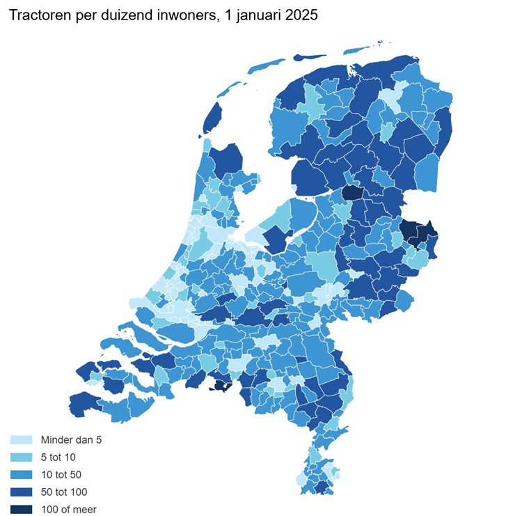 Op 1 januari 2025 telde Nederland 681 duizend landbouwvoertuigen met een kenteken. Onder landbouwvoertuigen vallen 303.000 trekkers, 256.000 aanhangers en 122.000 mobiele machines Trekkers zijn met een gemiddelde leeftijd van 33 jaar relatief oud. Dit meldt het CBS op basis van nieuwe cijfers over het motorvoertuigenpark.