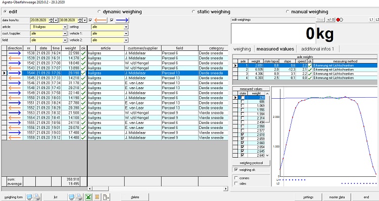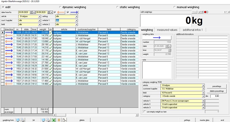 Met name de bijbehorende software overtuigden Ron en zijn zoon Erik van Laar. “Ook vanuit de gedachte van de loonwerker, die zo veel beter per klant kan bepalen wat die van een perceel haalt of er op brengt. Iedere keer dat je met een machine over de weegbrug rijdt, wordt de inhoud opgeteld. Iedere keer dat je over de weegbrug rijdt is het volle en het lege gewicht geregistreerd. Dit is alles op datum, tijd en rijrichting op de computer terug te vinden. Er kunnen tot wel honderd percelen per klant ingevoerd worden en zo kun je de opbrengst van verschillende percelen secuur registreren en bijhouden”, legt Erik van Laar uit.