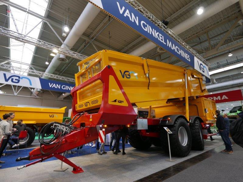 De Etna 22 hooglosser met meesturende achteras van VGM is niet te missen op de beursvloer. De twee dubbelwerkende cilinders maken het lossen, via de door twee hydromotoren aangedreven rubberen transportband, op een hoogte van 4,5 meter mogelijk. De trekboom is rubbergeveerd. De vier wielen zijn hydraulisch beremd en de kipper is radiografisch te bedienen. De kipper is optioneel naar wens uit te rusten, onder andere met een 1850 millimeter onderstel voor montage van 1700 millimeter hoge banden.